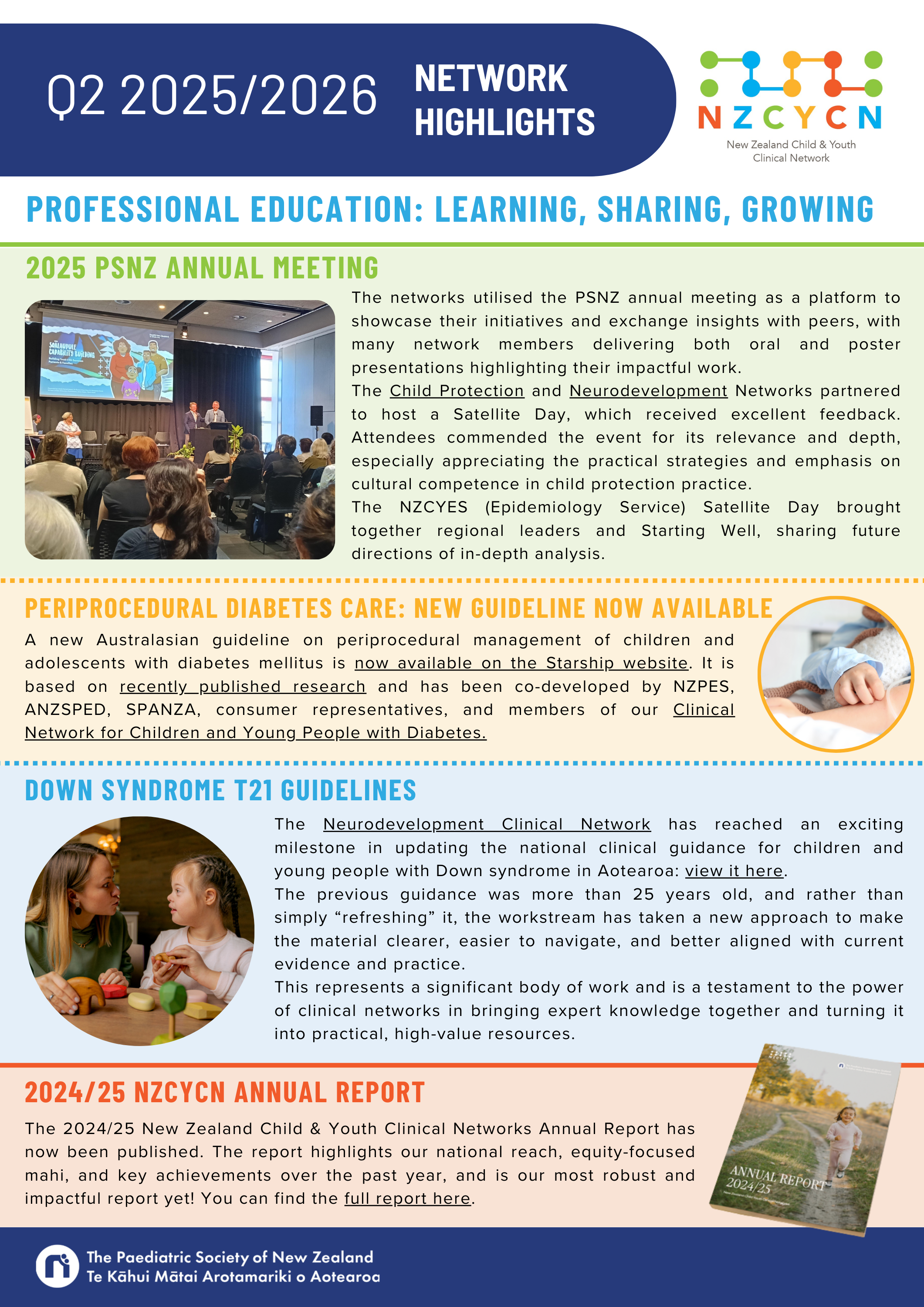 The New Zealand Child and Youth Clinical Network (NZCYCN) comprises ten Networks that focus on a range of speciality areas. All Networks aim to provide health professionals with resources to improve practice and to promote the delivery of equitable child and youth health services that improve health outcomes for all tamariki and rangatahi.