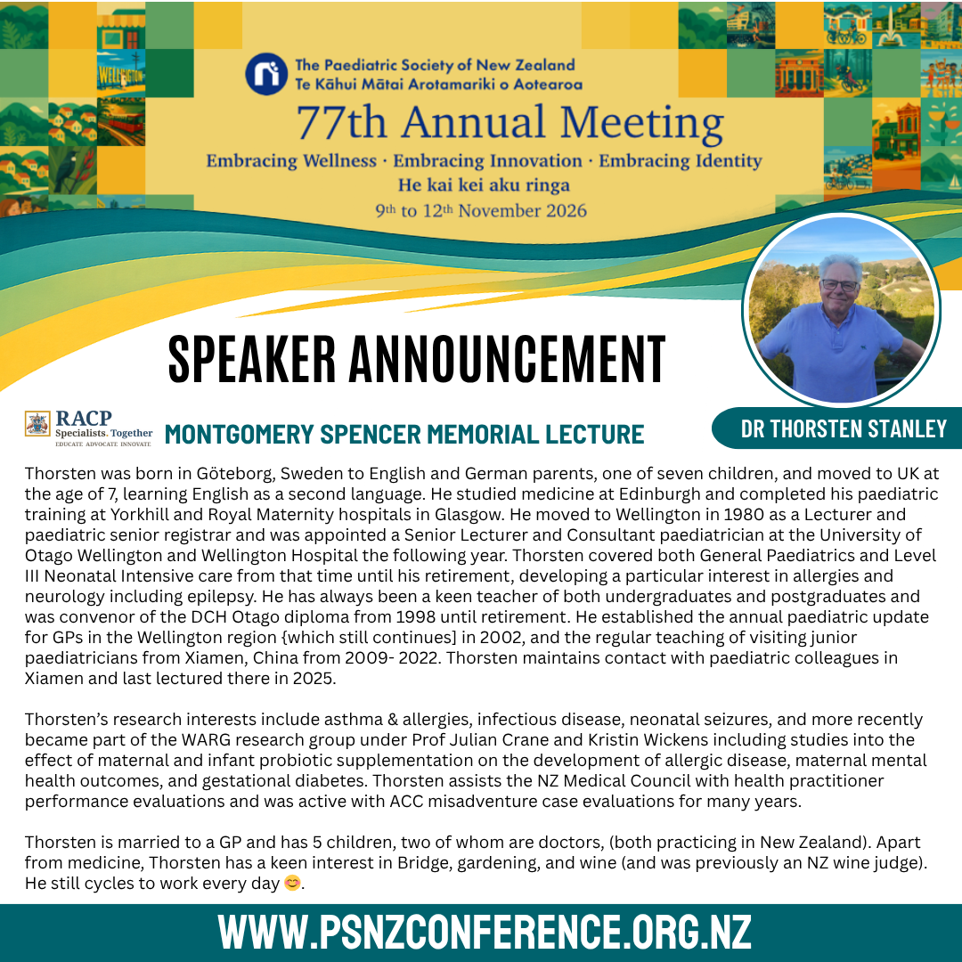 Please see the attached speaker announcement for more about Thorsten and his outstanding contribution to paediatrics in Aotearoa.